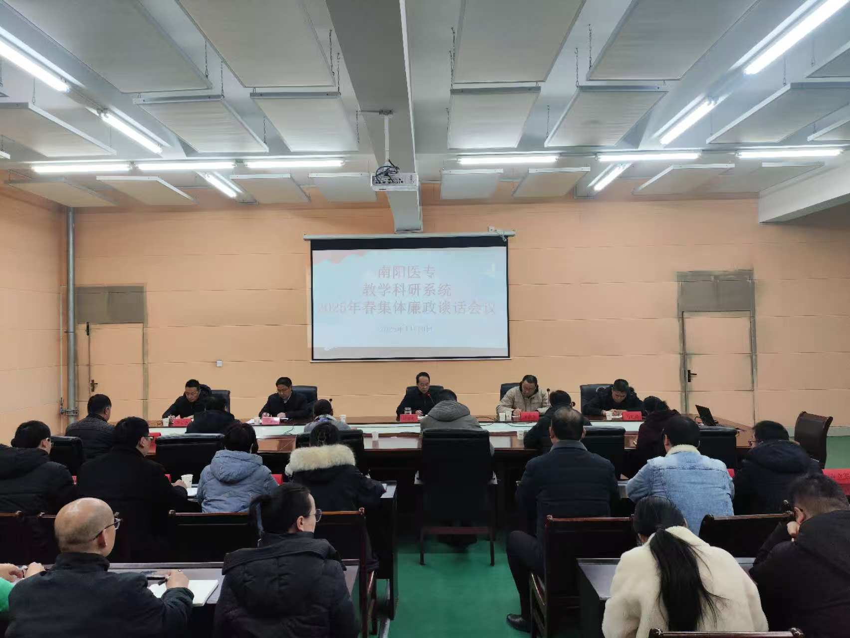 本网讯(文/体育保健与运动医学系 李朝)2025年1月10日下午,南阳医专教学科研系统集体廉政谈话会议在体育馆会议室召开,教务处、科研处、质量办、教学设备管理中心、科研中心、继续教育学院、基础医学部、公共艺术教学部、体育保健与运动医学系、针灸骨伤系、健康管理系等教学科研系统所属部门全体副科级以上干部参加会议。党委委员、副校长刘荣志到会讲话。
