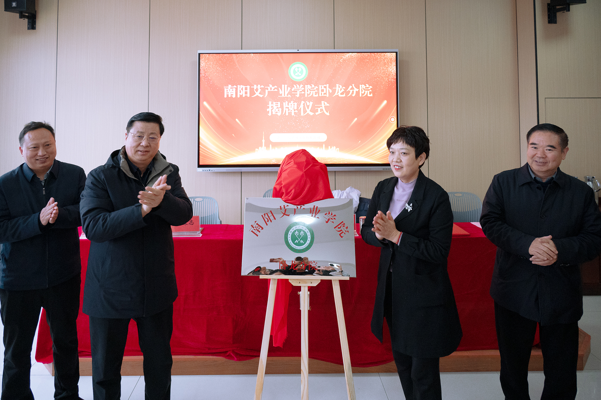 随后,范真校长和南阳产业投资集团党委书记、董事长余永海共同为“南阳艾产业学院卧龙分院”揭牌。