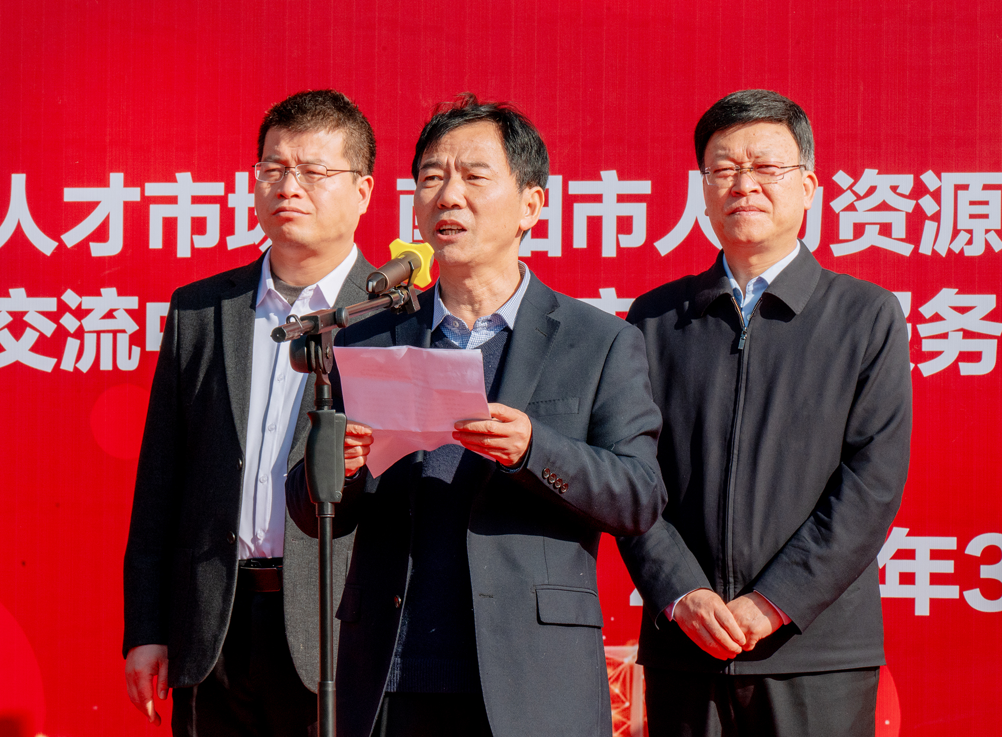 校党委书记柳明伟在致辞中介绍了学校推行“四证融合”,不断增强毕业生就业竞争力的做法与成效。勉励同学们积极与招聘单位沟通交流,找到适合自己的就业岗位。学校将与行业企业和用人单位在校企合作、科技服务、基地建设等方面持续开展合作交流,实现产学研融合与人才供需有效对接。市人社局二级调研员柯其锐,桐柏县卫健委党组书记周晨阳及用人单位代表、毕业生代表先后发言。