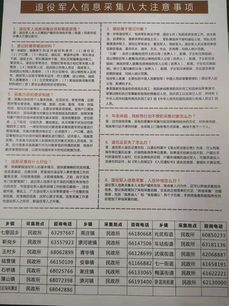 根据武侯和卧龙岗街道办事处的安排,从即日起至11月30日,对医专社区的退役军人进行信息采集,退役军人需携带身份证、户口簿、转业证、退伍证、离休证等相关证件登记录入,转业军官携带证件直接到卧龙区社保局进行信息录入。其他人员,户口地址在卧龙路131号的,携带证件到东校区社区办公室先登记,随后再通知时间,到武侯办事处进行信息录入;户口地址在车站南路47号的,于12月7、8日到卧龙岗办事处服务大厅进行信息录入;户口地址在其他地方的,到所在辖区办事处办理。