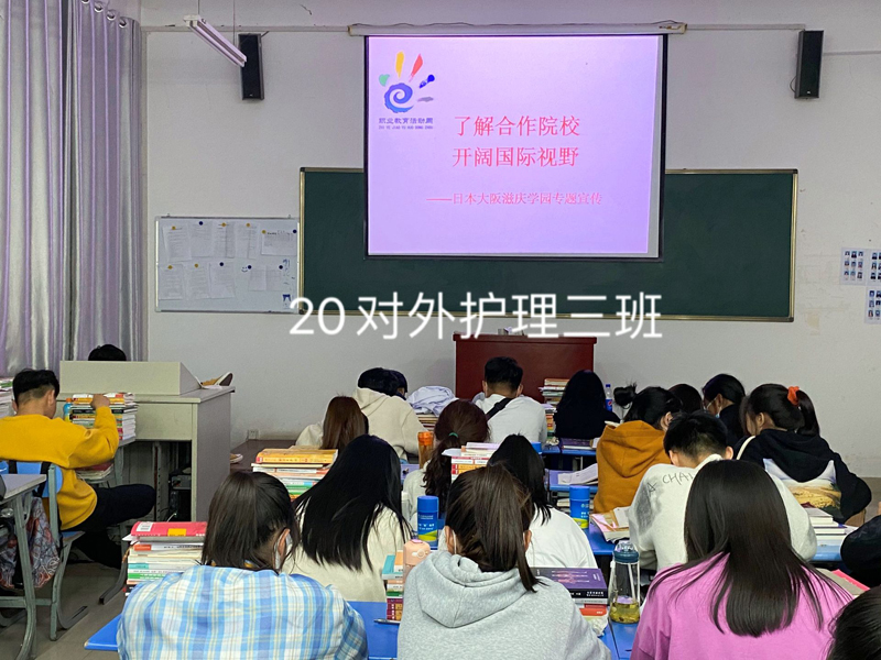 各班辅导员组织学生观看日本大阪滋庆学园宣传片,了解日本文化、校园环境、专业特点以及日本教育教学理念。此次宣讲活动使同学们对日本历史文化、国际护理专业的发展现状和前景有了更深的了解,开拓了学生们的国际视野,坚定了同学们学好语言和专业课的决心。