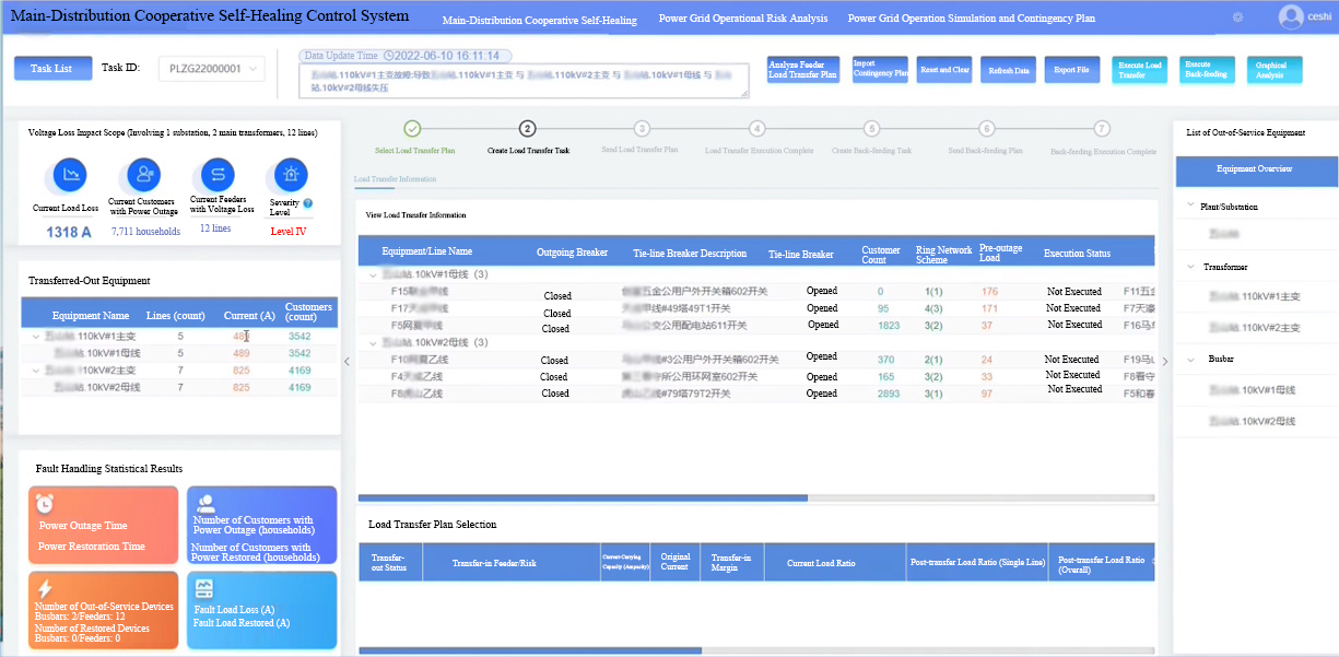 The transmission-distribution coordination fault diagnosis and self-healing control system resolves large-scale, prolonged feeder load outages during transmission network faults through comprehensive element coordination. By systematically analyzing distribution network operation data, it implements feeder load transfer for transmission network faults, provides multiple feeder transfer options, automatically selects optimal schemes, enhances transmission network fault transfer capability, and reduces operational risks.