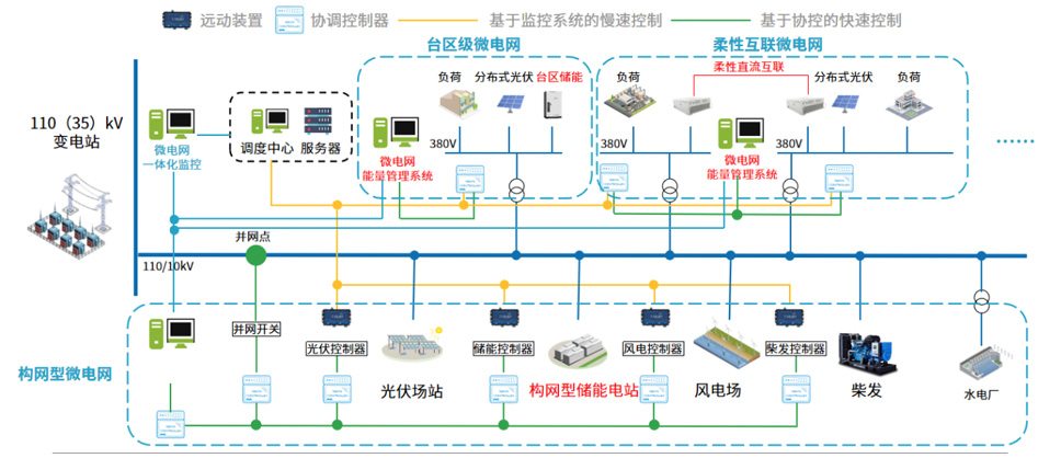 方案包括台区级微电网、柔性互联微电网、构网型微电网以及微电网群。微电网系统方案集成分布式电源、储能系统和智能管控平台,对光伏电站、风电场、储能、可调负荷进行实时调控。