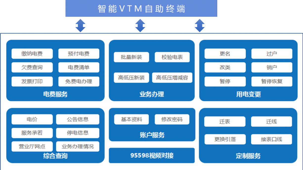 智能VTM自助服务终端融合传统电力营业厅的服务功能,是集业务办理、电费服务、综合查询、账户服务、用电变更、定制服务等多功能于一体的智能化互动服务平台,也是实现电力企业与客户之间友好互助、为客户提供智能化和多样化互动服务的一站式电力客户服务和展示平台。与传统的ATM相比,VTM功能更全面,能够取代90%以上的传统人工柜台服务,并且能够填补柜台面对面服务与自助服务之间的空缺,并为客户提供7X24小时不间断的信息服务。